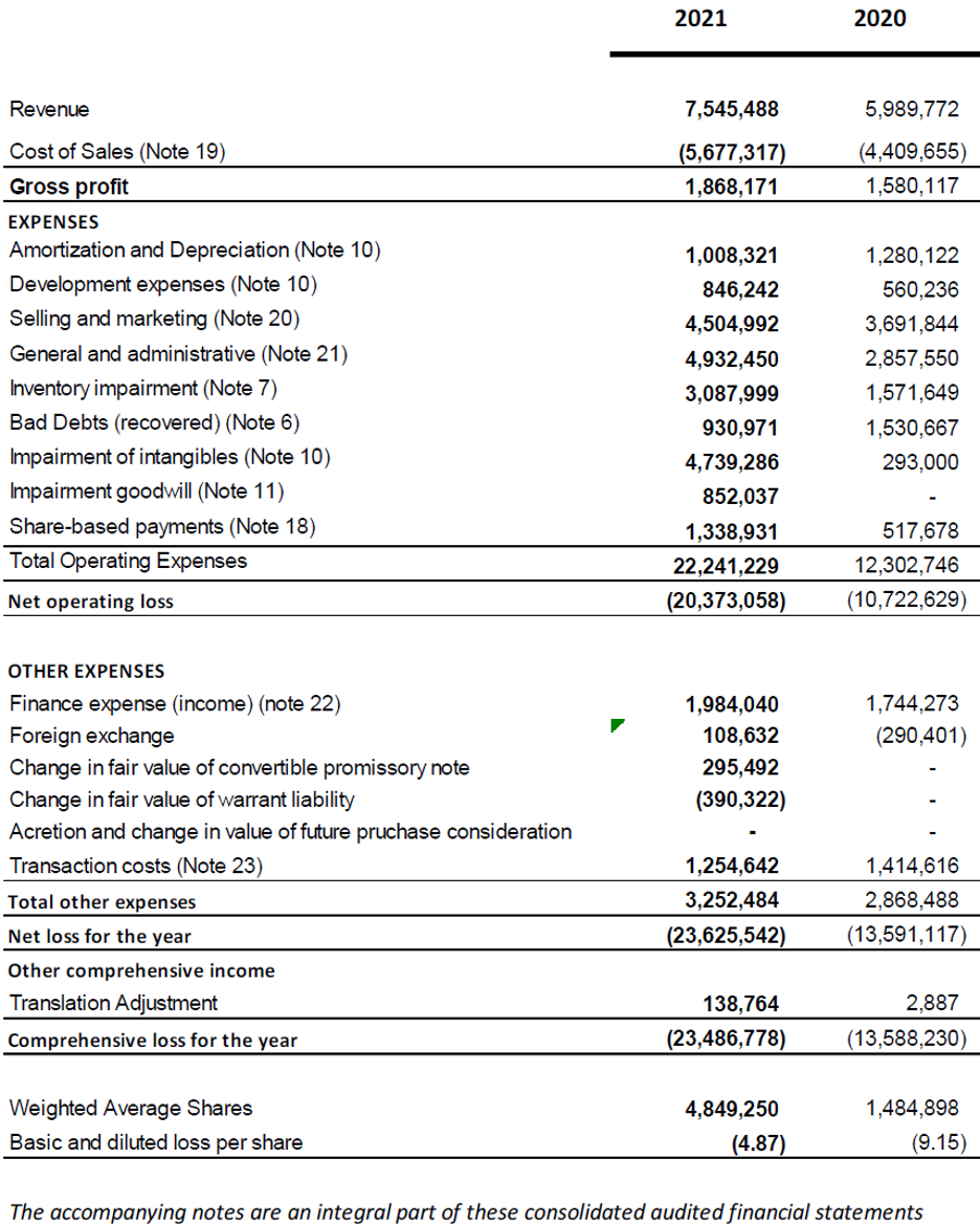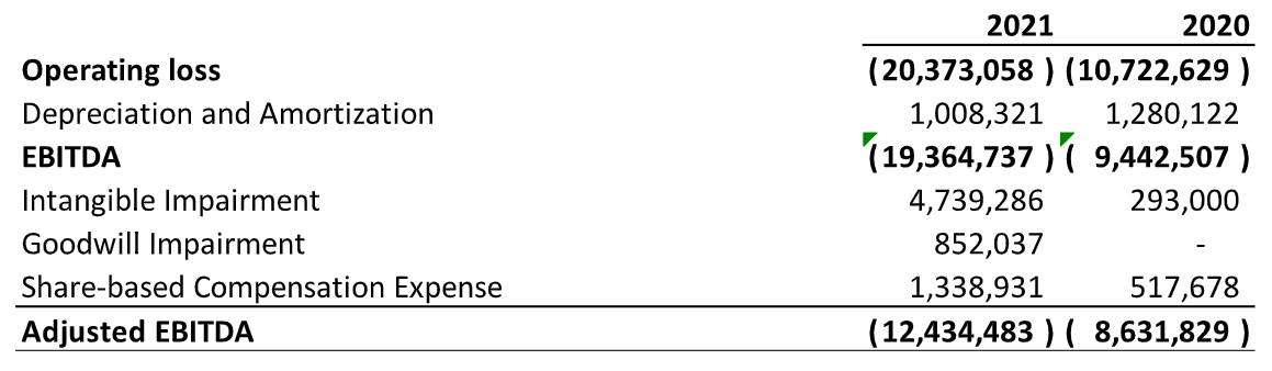 For the three months ended December 31, 2021 and 2020, the adjusted EBITDA is ($2,666,087) and ($6,744,797), respectively, a positive variance of $4,078,710. Adjusted EBITDA is defined as the net operating loss excluding depreciation and amortization, intangible impairment, goodwill impairment and share-based compensation expense.